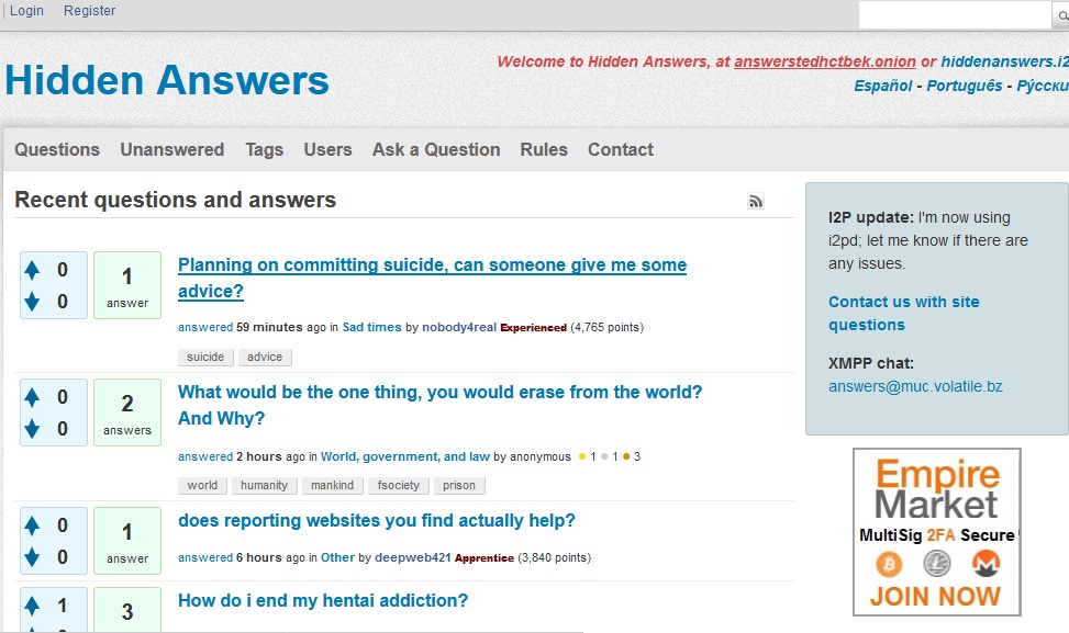 Hidden Answers is the dark web’s version of Reddit or Quora, where you can ask anything without getting censored. While it may look outdated and abandoned, the community members will still answer your questions. While it’s a deep web forum where users can ask questions privately, you will see a lot of marketplace banner ads on it, as that’s a common method of monetization on such community-based Tor websites.