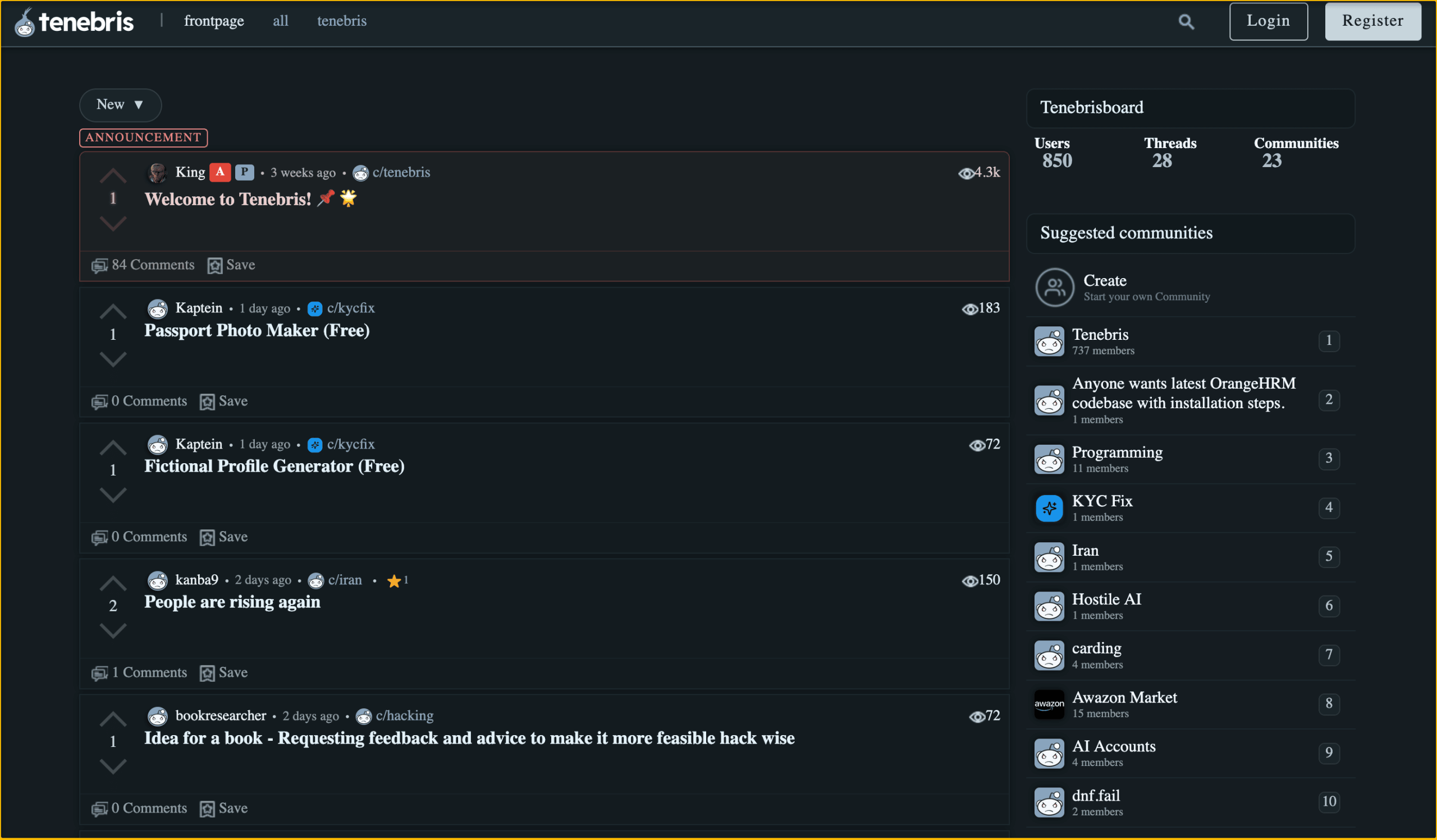 - Tenebris: A Q&A community similar to Reddit, focused on anonymous discussions with complete freedom.