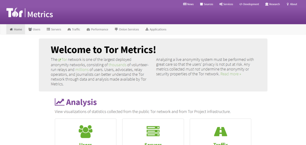 Tor Metrics is the official site that tracks and publishes statistics about the Tor network (as the name hints). It provides data on user numbers, relay performance, and traffic trends.