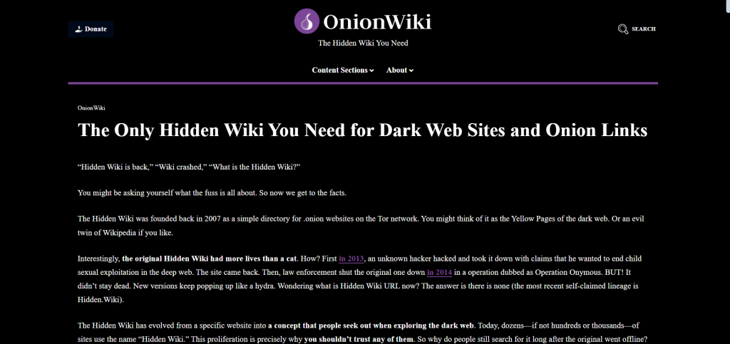 While it’s not an onion website, OnionWiki is the starting point for many users’ journeys into the darker corners of the Internet. As its name suggests, the website is a directory that lists .onion sites, serving as a basic guide to navigate the dark web. It is built on the idea of “the Hidden Wiki,” which is a vast repository of many of the popular dark websites on the Tor network. Unlike Google, Yahoo, or a darknet search engine, you don’t get to search for a website, but only see a curated list.