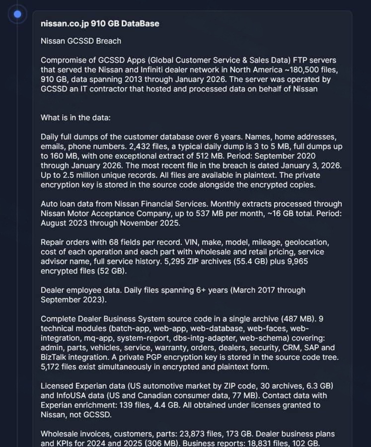 The hackers claim the stolen data is massive. They say it includes daily customer database dumps spanning six years, auto loan records from Nissan Financial Services, dealer employee details, repair orders, wholesale invoices, and business reports.