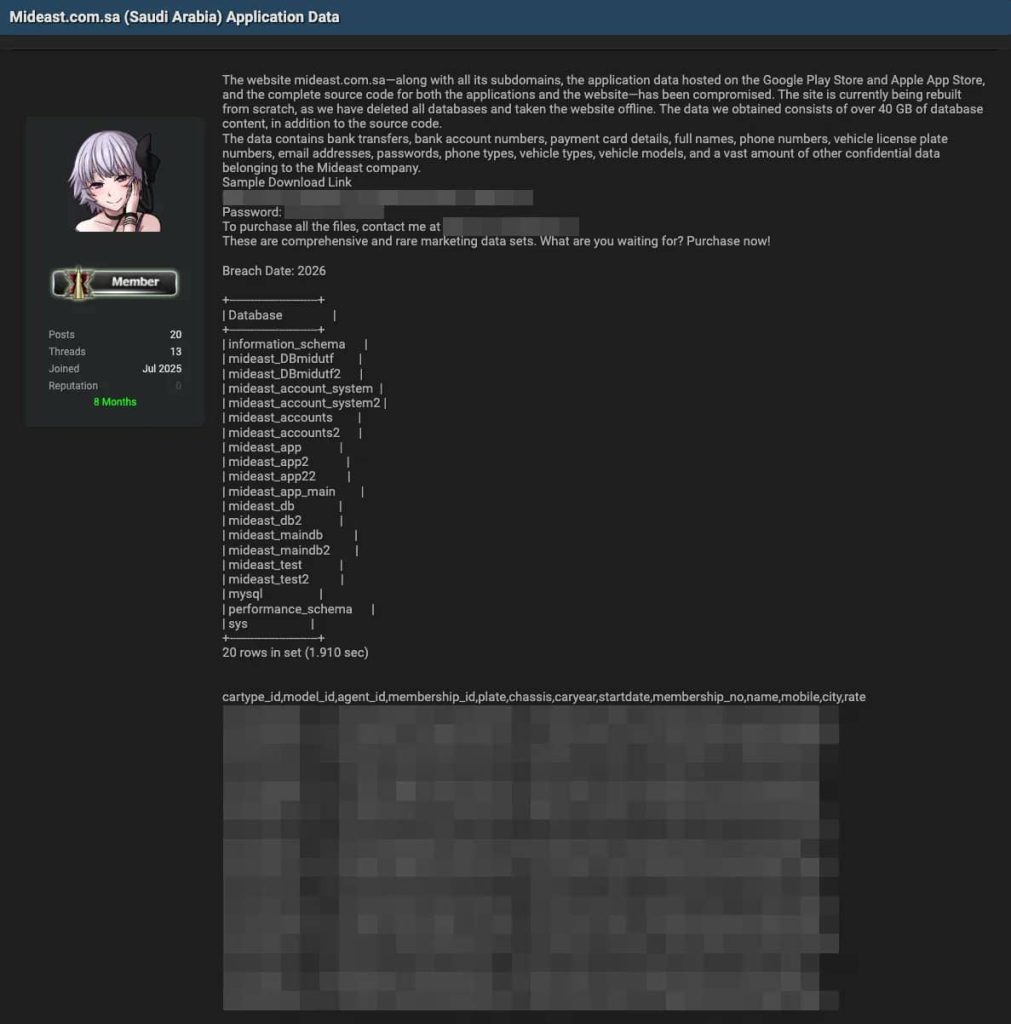 Mideast, a Saudi Arabian company witnessed a cyber breach, with the attackers stealing 40GB of data, payment cards, bank accounts, and vehicle details inclusive.