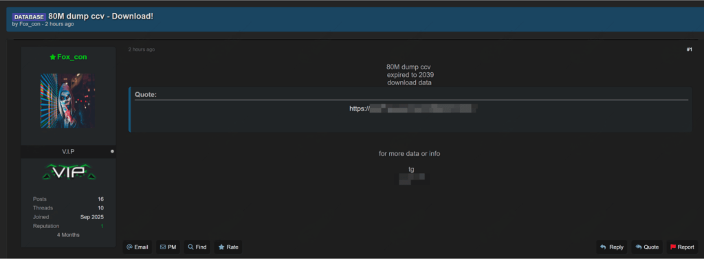 The data bazaar didn’t stop there. Another listing promises a huge aggregated dump of 80 million credit card records. The seller mentions that the data includes CVV numbers and has cards with expiration dates stretching to 2039.