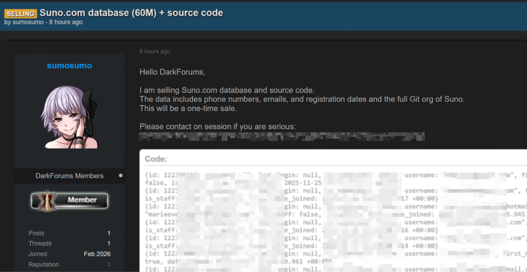 First up is Suno, the popular platform that generates music from text prompts. A threat actor is advertising what they claim is Suno’s entire database and source code. The posted details are specific and alarming.