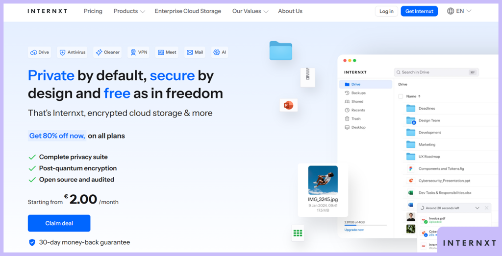 - Internxt: Enables anonymous account creation with no KYC required. The free plan offers 10GB lifetime storage, while €299 provides 2TB lifetime access with a one-time payment.