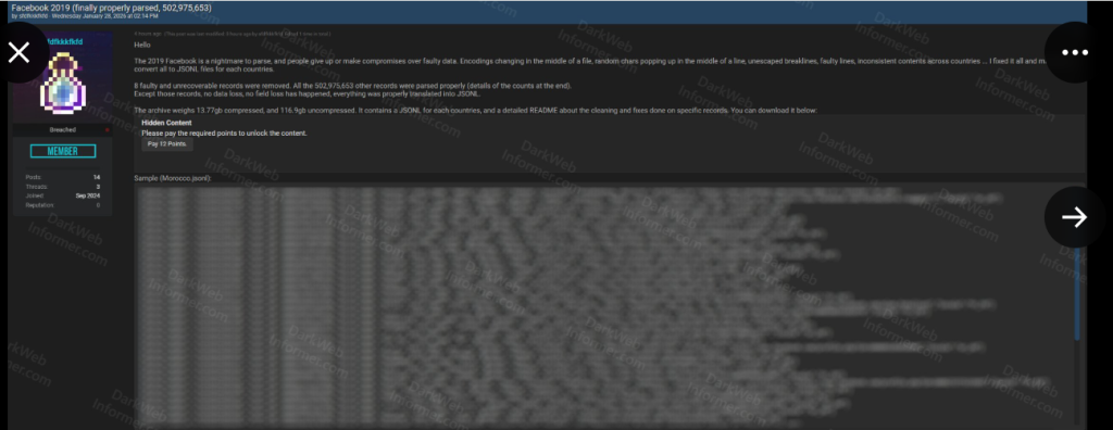 According to a recent report, a threat actor recently posted a fully parsed dataset from this breach on a hacking forum. They boasted about the difficult cleanup work. “The data from the 2019 Facebook breach is a nightmare to parse,” they wrote. They claimed to have fixed encoding errors and faulty lines.